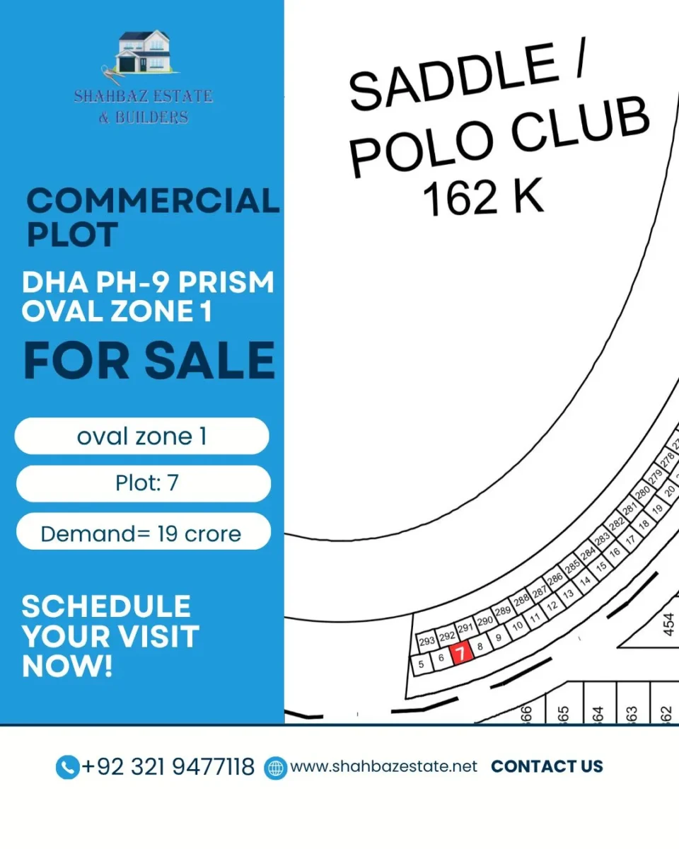 commercial plot in DHA phase 9 prism oval zone 1 plot: 7 is up for sale direct from Shahbaz estate & builders. this plot is located at the front of polo club, college, & jv commercial site demand for this plot is 19 crore pkr to schedule your visit or to avail any of our services feel free to contact Shahbaz estate & builders.
