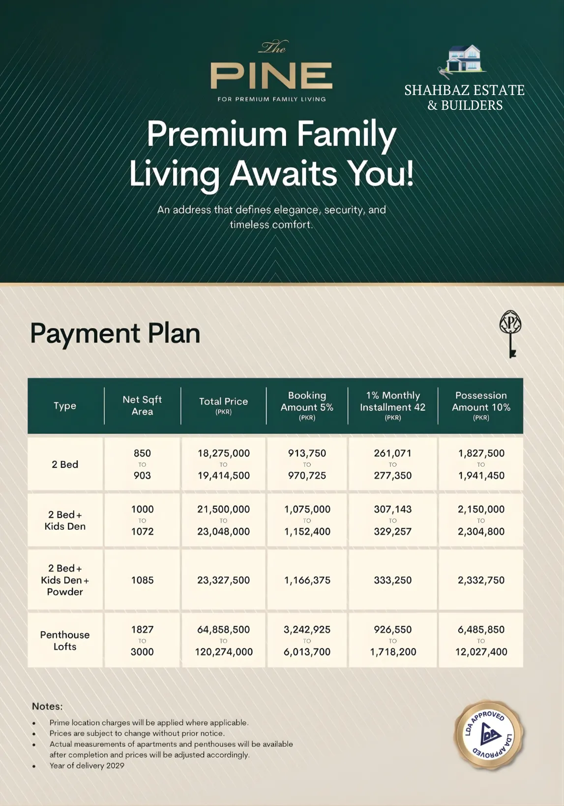 This building consist of 15 floors, 2 basements, ground floor dedicated masjid & park. Also there are 50+ amenities in this building containing swimming pool, gym, play area etc. this building consists of 2 bed, 2 bed+ kids den & penthouses. the development work is already started. for more exclusive details contact Shahbaz estate & builders
